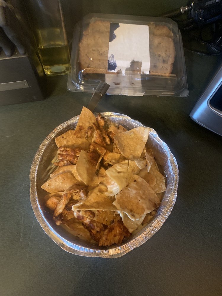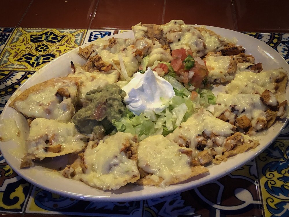 Chips topped with ground beef, shredded chicken, beans, and cheese sauce. All covered with lettuce, guacamole, sour cream, and a tomato slice.